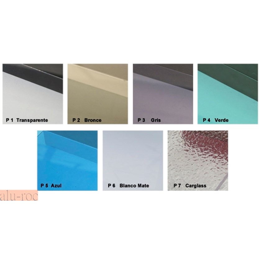 * Siete colores de policarbonato compacto técnico macizo BAYER Maklorón de 4 mm. (no alveolar hueco), o de marca de calidad similar (primeras marcas según disponibilidad).